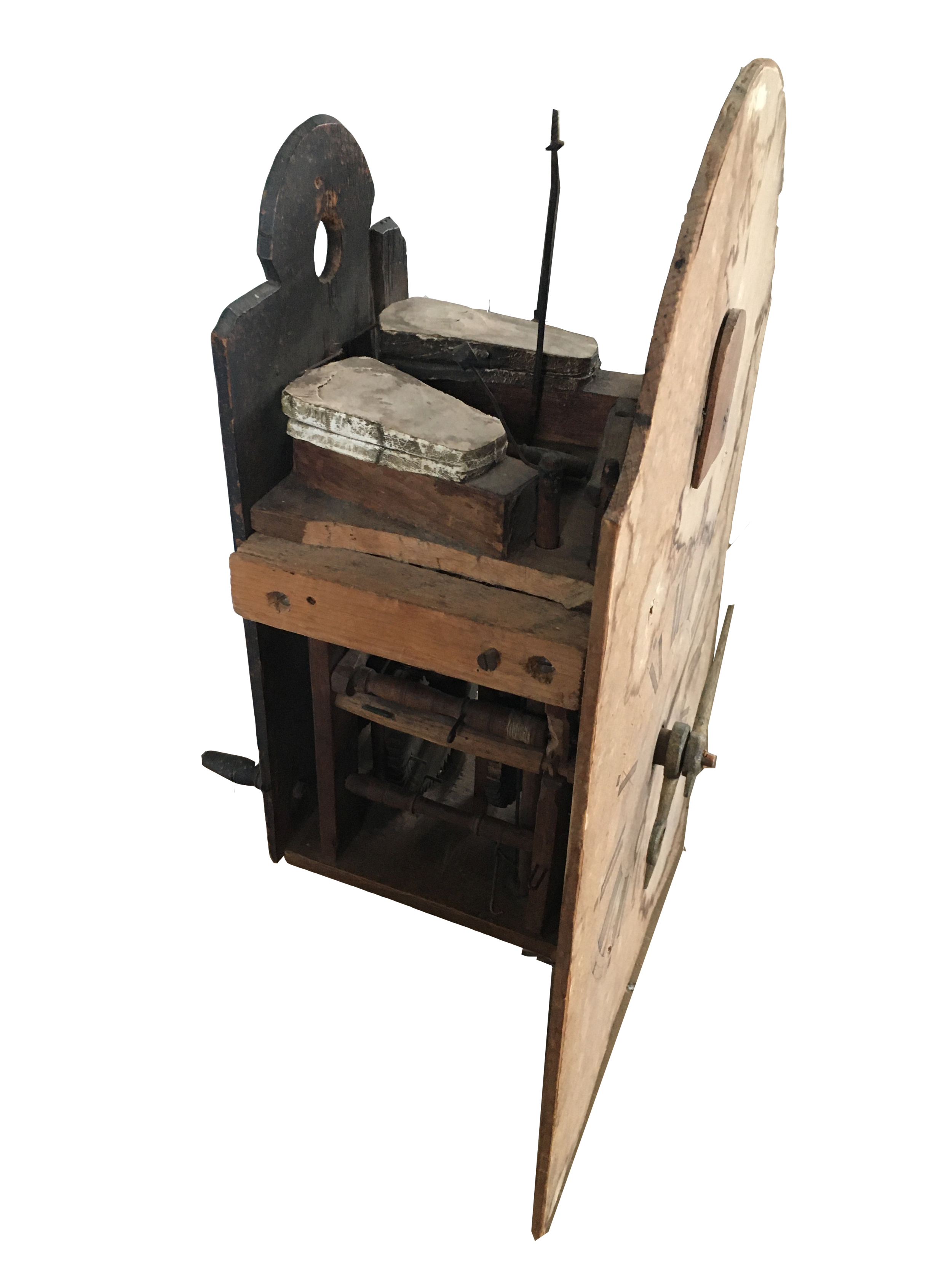 Uniquely lacking decoration on its clock face, this clock was owned by Rachel and Heinrich Stieff (Steeves). When they relocated in 1763, the clock was brought with them to Canada all the way from Germany, an impressive journey for a simple cuckoo clock of the time. In fact, this clock represents one of the earliest models of the cuckoo clock known today. There is no cabinet surrounding the clockwork of this mold, which is also a characteristic of this popular design, and unfortunately, its bells and cuckoo bird have been lost to time.